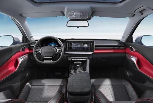 内饰部分,新车内饰设计整体看上去十分简洁,全液晶仪表与中控大屏相连,中控台纵置的空调出风口十分的具有设计感,黑色饰板与红色饰板的组合也使得车厢内看起来更加的年轻。