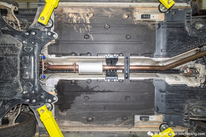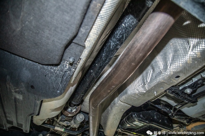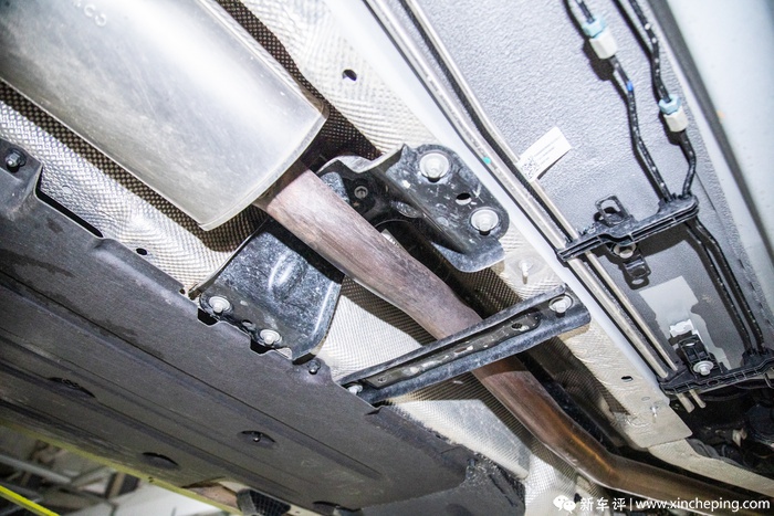 在排气管中段、三元催化器后一点的地方也可以看到两块加强件,在保护排气管的同时也能增强一些底盘的刚性,而且从排气管头端一直到中段末尾的地方都设有铝箔板,而头端和中段也正式是排气管最热的地方,在铺设铝箔板之后可以降低排气热量对车内温度的影响。