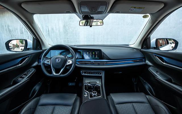 内饰部分,新车同样是使用了家族式的设计语言,但是增加了电动车专属的蓝色装饰,10英寸的全液晶仪表以及10.25英寸触控中控屏采用一体式设计,为内饰增添了一丝科技感,车机系统采用腾讯梧桐车联,支持语音助手对车辆进行控制。