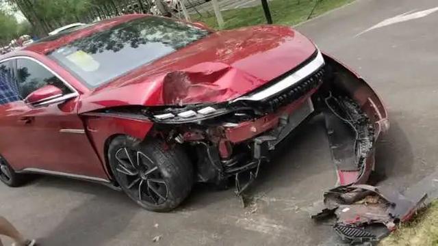 看看网络里传的碰撞图,前脸伤的比较狠,前保险杠脱落、机舱盖变形、左右翼子板变形、轮胎轮毂变形位移,但关键部件A柱没事。