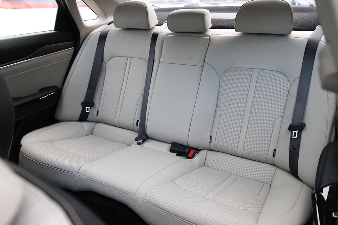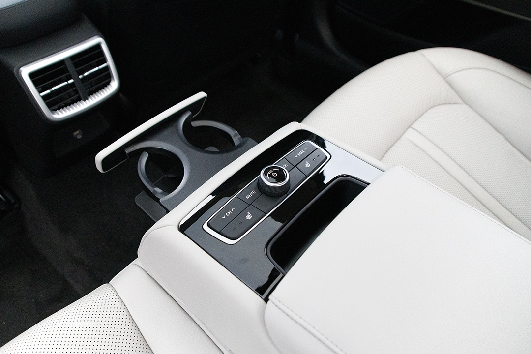 后排座椅有三个独立头枕,地台中间鼓包,高度可接受,但实拍车型并不支持座椅放倒。中央扶手放下后可以看到有配备座椅加热和多媒体控制及伸缩式杯架。在其它配置上有独立空调出风口,但一个USB充电接口数量着实偏少,建议厂商再增加一个。