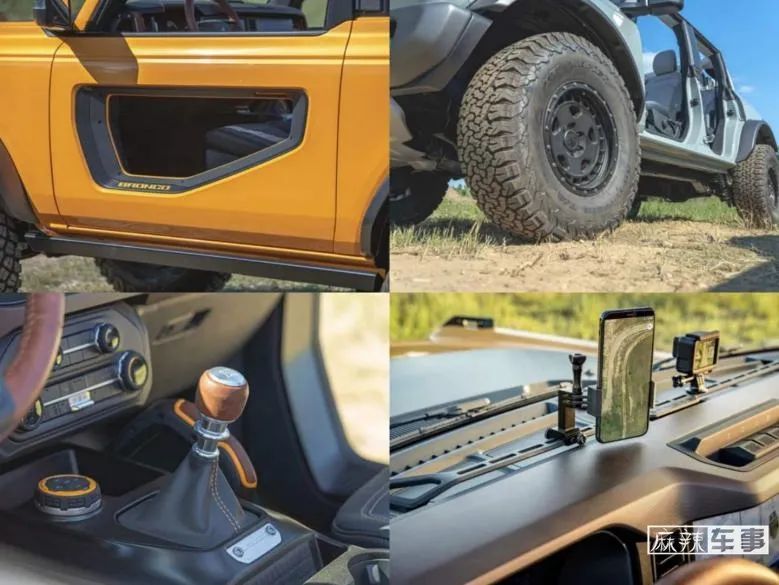 全新Bronco可以说是“出厂即巅峰”。非承载式车身、前双叉臂后整体桥悬架、全系标配四驱、全系标配地形选择系统、全系可选装35寸泥地胎。另外,越野版车型可选装前后硬锁、电控分动箱、坦克掉头、前防倾杆电动断开、低速蠕行以及超过200项可选装的副厂越野配件,就算级别更低的城市版也有后差速器以及100多项越野配件可以选择。这几乎囊括了越野车的所有配置,也直接省去了越野爱好者的后期改装,全套的越野装备直接把Bronco武装到了牙齿。