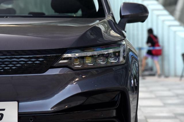 从第一印象来看,天美ET5更像一台燃油车,整体给人一种四平八稳的感觉,前脸的线条比较大胆,封闭式格栅上进行了菱形装饰,下方保险杠区域使用夸张的内凹式处理。头灯造型有棱角,线条和车头弧度融合,并采用了LED光源。