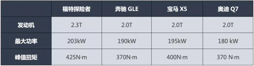 通过对比不难发现,相比与宝马X5、奔驰GLE、奥迪Q7车型所搭载的2.0T发动机,探险者搭载的2.3T发动机无论在排放、功率还是扭矩的表现都可圈可点。传动方面,探险者搭载10速自动变速箱,在动力足够强的同时,兼顾平顺与燃油经济性。