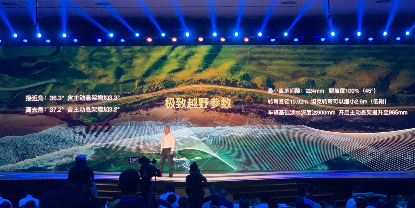 越野参数上,实现了100%(45°)的爬坡度,接近角为36.3°、离去角为37.2°、车辆基础涉水深度达900mm,并拥有主动悬架,当主动悬架开启后上述各越野参数均会得到进一步提升。