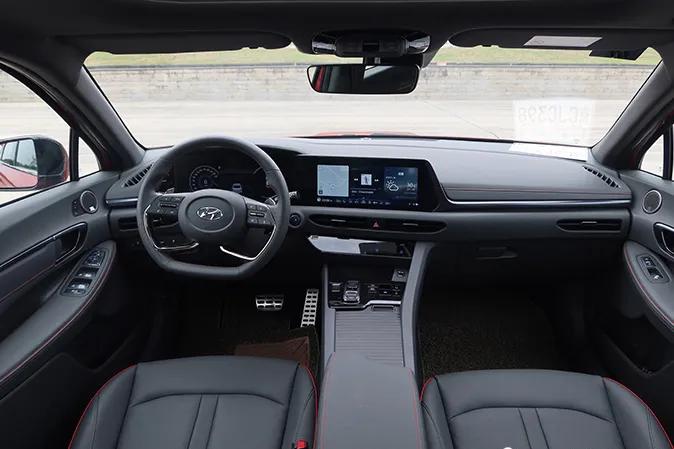 打开车门,数字化智能座舱是第十代索纳塔车厢的重头戏。双回旋对称式C型设计的D-cut方向盘搭配按键式电子换挡令整个车厢的内饰氛围科技感与动感并存。