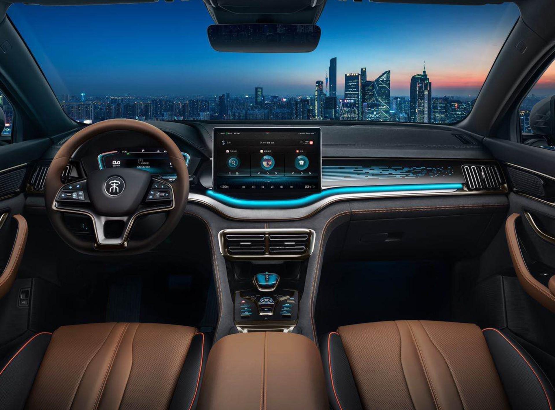 新车在内饰上采用比亚迪最新一代家族式设计,除了借鉴诸多中国古典建筑的设计基因,还采用了中式对称美学效果,其营造出的氛围也较以往更加精致。车辆的12.8英寸中控屏内置第三代DiLink智能网联系统,并采用了全新的UI设计。