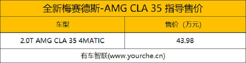7月24日,在2020成都车展上梅赛德斯-AMG CLA 354MATIC车型上市,新车仅推出一款车型,售价43.98万元。新车定位于紧凑型四门轿跑车,并采用大量AMG套件,使整车更具运动属性。