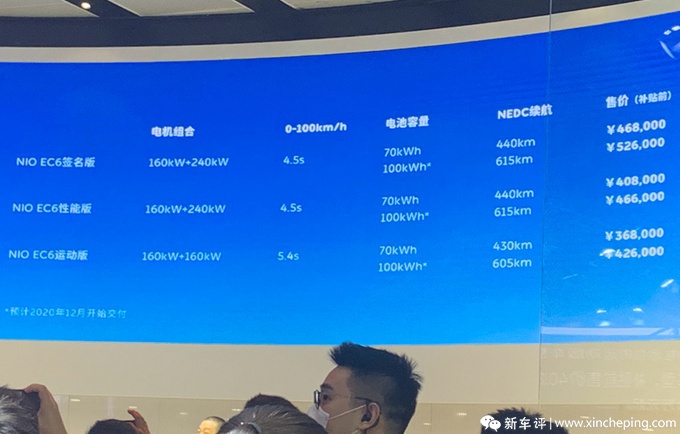 7月24日,在成都车展媒体日,蔚来汽车宣布旗下第三款量产车型,轿跑型SUV EC6正式上市,共推4种NEDC续航版本,包括430km、605km、440km和615km,最快0-100km/h加速4.5秒,6款车型售价区间为36.8-52.6万元。即日起开启大定,预计在9月下旬首批交付,其中100kWh版本将在12月份交付。购车享终生免费质保、换电和异地加电等服务。