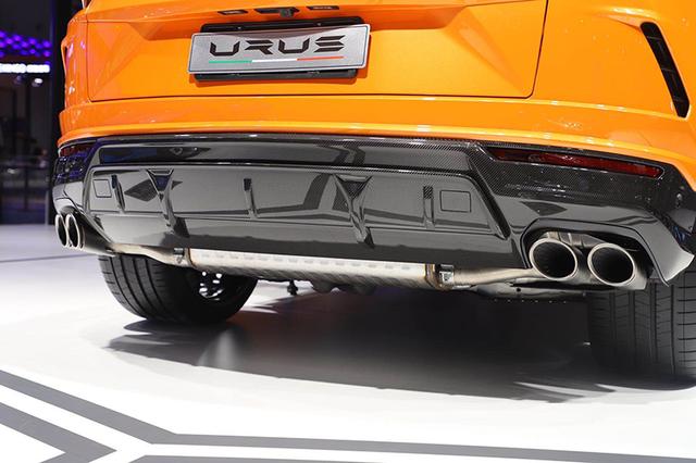 车身尾部,新车LED尾灯点亮后显示出Y字形,与前大灯相互呼应,且黑色面板中央还镶嵌了“Lamborghini”标识。另外,Urus特别版大面积黑色护板两侧为双边共四出尾排的排气布局。