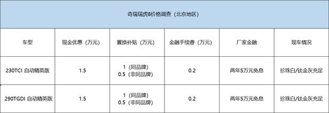 注:此价格调查仅针对北京地区2020款瑞虎8进行,为近期有购车意向的北京消费者提供适当参考。