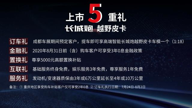 同时,还推出了上市五重礼,分别是订车礼、金融礼、置换礼、互联礼、服务礼,回馈广大用户及粉丝对长城炮的支持与厚爱。