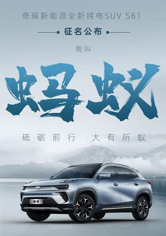 近日,从奇瑞新能源官方了解到,旗下代号S61的全新纯电动SUV定名为“蚂蚁”。