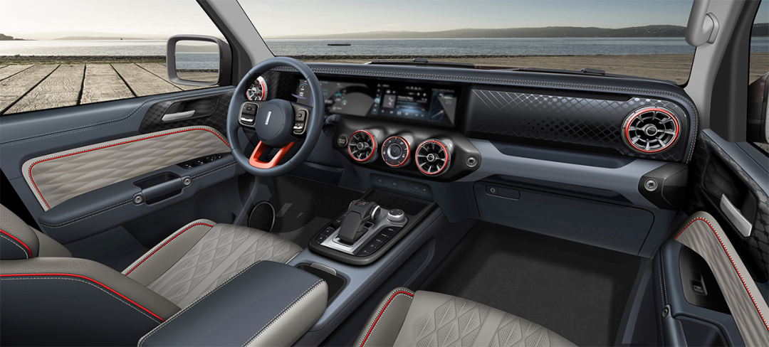 内饰方面,虽然在展台没有开放体验,不过从官图来看,坦克300的设计上和外观相呼应,应用了方和圆的元素,包括方形的两块12.3英寸液晶屏幕、方菱形绗缝内饰板,以及圆形多功能仪表、圆形空调出风口、圆形功能旋钮等。