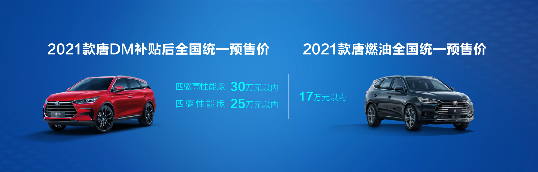 7月24日,据官方渠道获悉,2021款比亚迪唐开启预售。本次将推出燃油版、四驱性能版和四驱高性能版共三款车型供消费者选择。其中,2021款比亚迪唐燃油版预售价为17万元内,2021款比亚迪唐DM (配置|询价)四驱性能版预售价为25万元内,而四驱高性能版为30万元内。除此以外,比亚迪官方还给出了惊人的优惠政策。