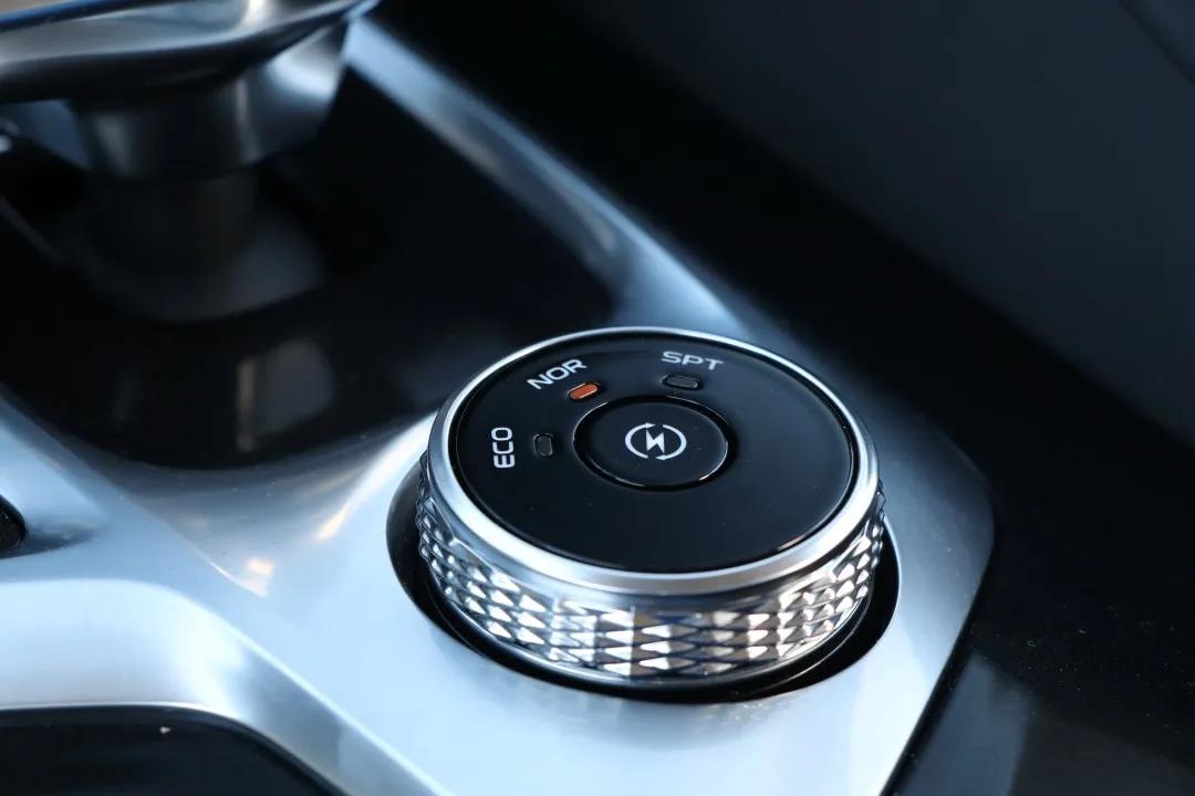 位于挡杆方面的旋钮主要负责驾驶模式和动能回收力度调节,旋转外圈即可切换ECO、NORMAL以及SPORT模式,点击中央按键则可在“B+”和“B-”两种回收力度间切换。