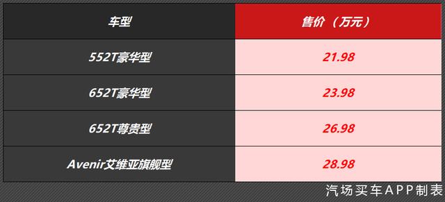 652T车型以及Avenir车型继续搭载2.0T发动机,最大功率为237马力(174kW),峰值扭矩为350牛·米。