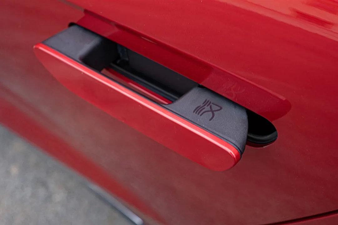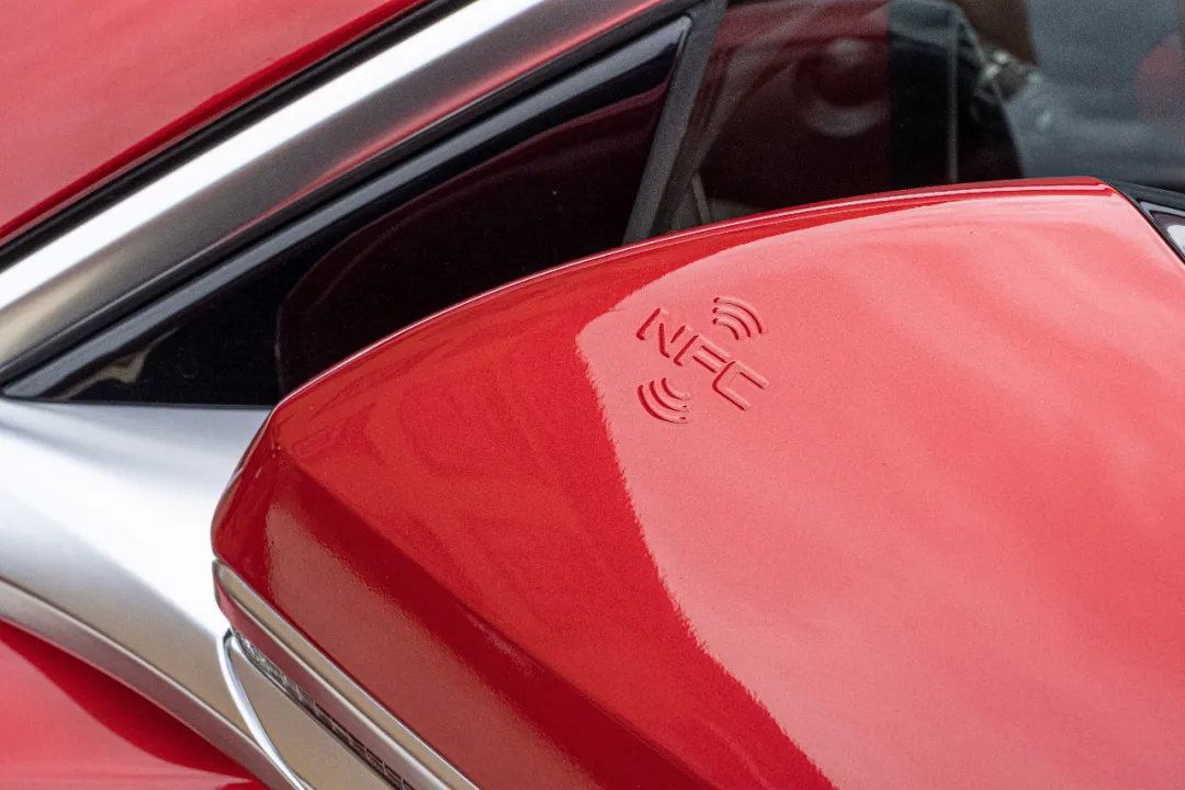 车侧的设计亮点在于隐藏式门把手,开启之后还有汉的LOGO,看得出来比亚迪足够用心。后视镜上面还有NFC钥匙的感应区,就算手机在没网没电的时候也可以正常运作,逼格满满。而C柱三角窗后的装饰板可以很明确地区分长续航和高性能版,长续航版是亮黑色,高性能版是银色。如果让我选我更倾向选装碳纤维的。