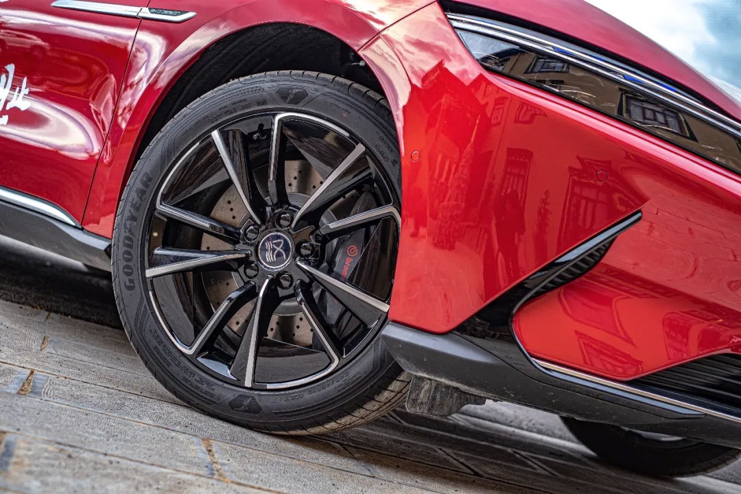 这辆比亚迪汉EV的车身长宽高分别为4980/1910/1495mm,轴距为2920mm;作为一款中大型车,这个尺寸算是中规中矩,不过空间却意想不到的敞亮,这都是后话。咱们接着看看它的造型,车侧部分的设计看起来相当结实,打个比方,就好像是一只潮爆了的小斗牛,肌肉线条饱满,但是又不会很凶。19英寸的轮圈足够让车辆的视觉重心变低,多辐条的造型也不会显得很廉价。