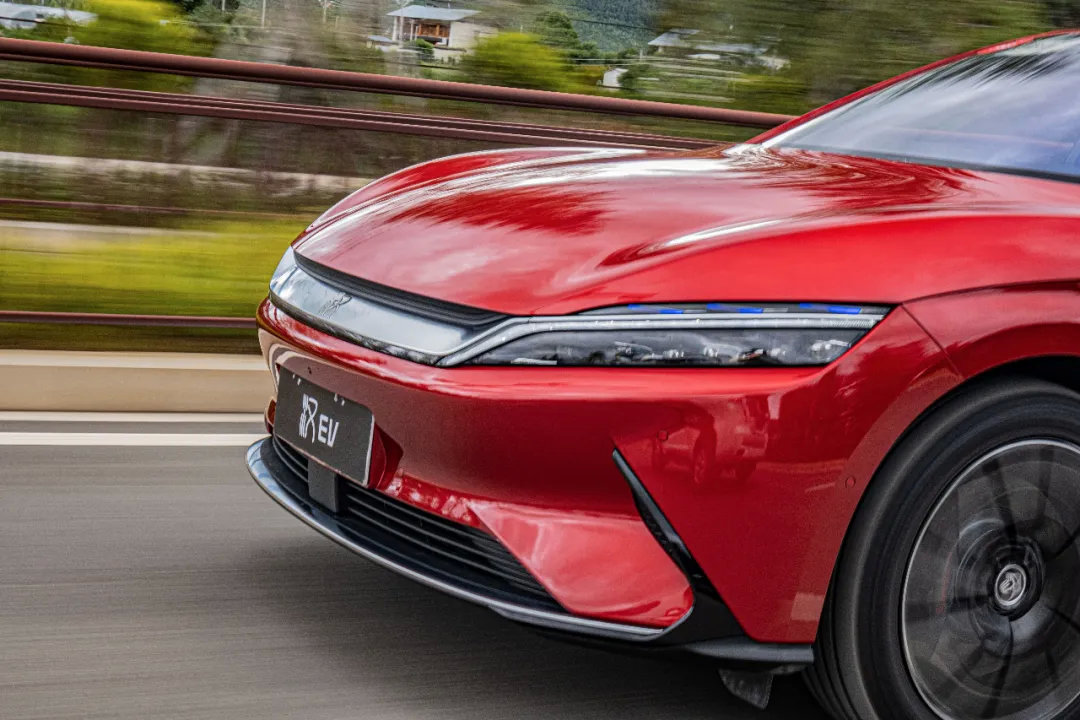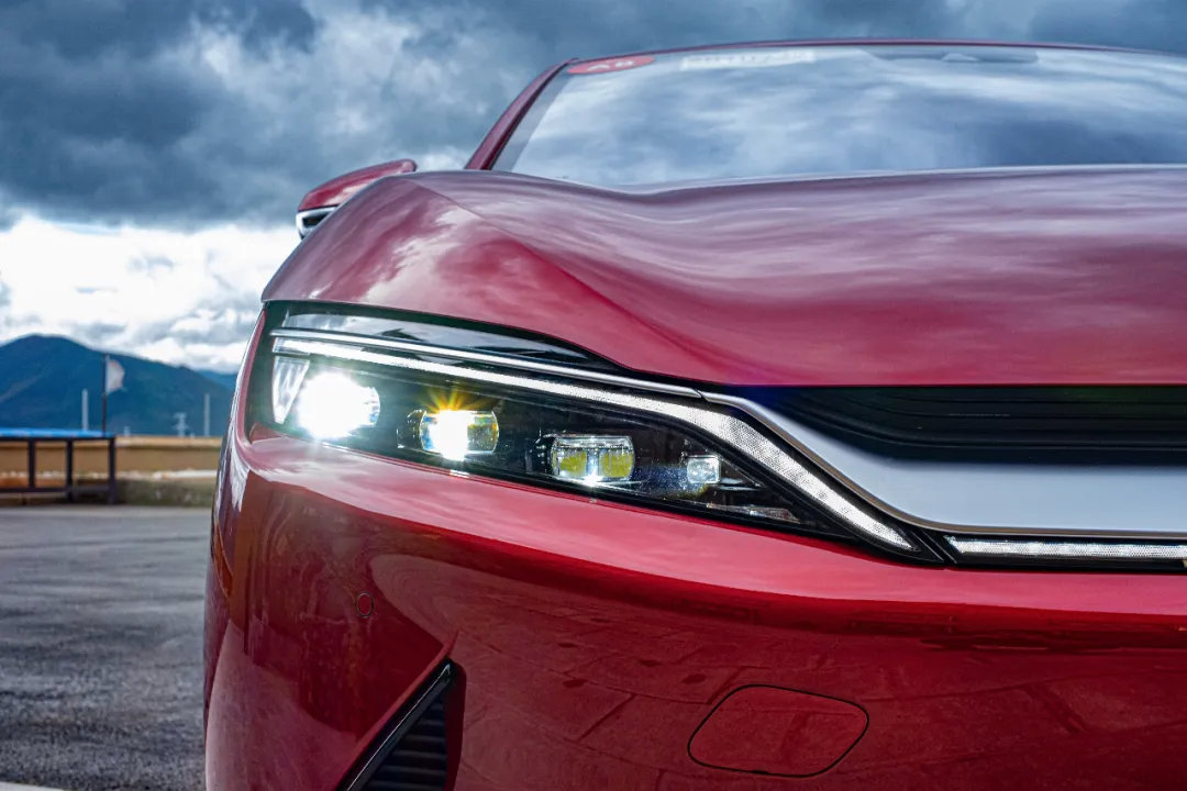 车头的造型足够精神,这得益于比亚迪全新的家族设计,我们试驾的是比亚迪 汉EV (配置|询价) 四驱性能版旗舰型。由于没有进气格栅的必要,整个车头的设计便更加激进,贯穿左右的银色饰条上面汉的浮雕LOGO是由篆书和现代汉字组成,相当有质感。下半部分左右黑色饰条形成两条“龙须”,整体造型还是以“龙”为灵感,象征中国的文化元素,而细长的矩阵式LED大灯则增添了一些科技氛围。