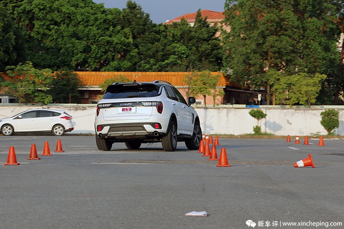 而在做18米绕桩时,其实更能感觉到领克01的可控性和尾巴的循迹性,因为在绕桩时难免会出现车轮往外甩的情况,比如同场的尚酷就是典型的车头重,所以推头很明显,而领克01就非常均衡,重心转移很快,尾巴的跟随性也非常好,车头摆过去之后,尾巴能迅速的扭转重心,然后跟随车头进入下一个桩桶,这样的表现其实说明了领克01这辆车的底盘调校功力、整车辆的重量、平衡分布都达到了很高的水准。