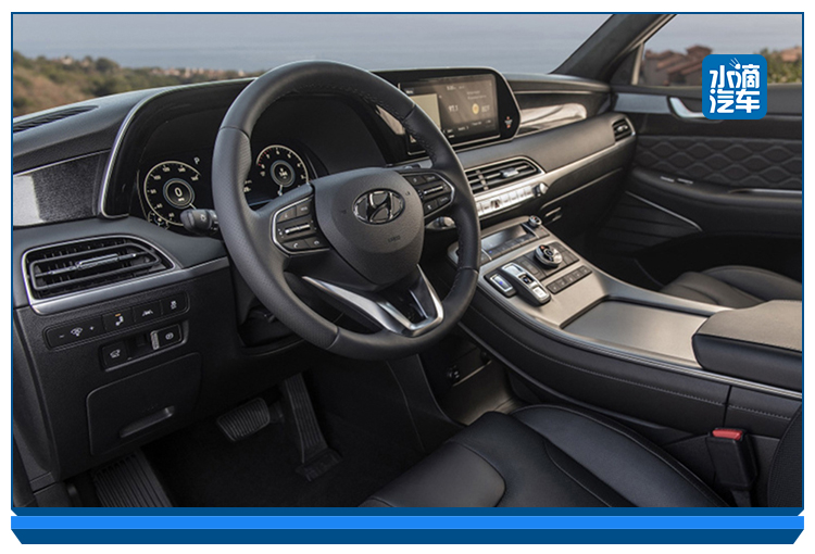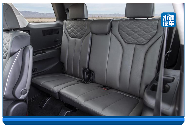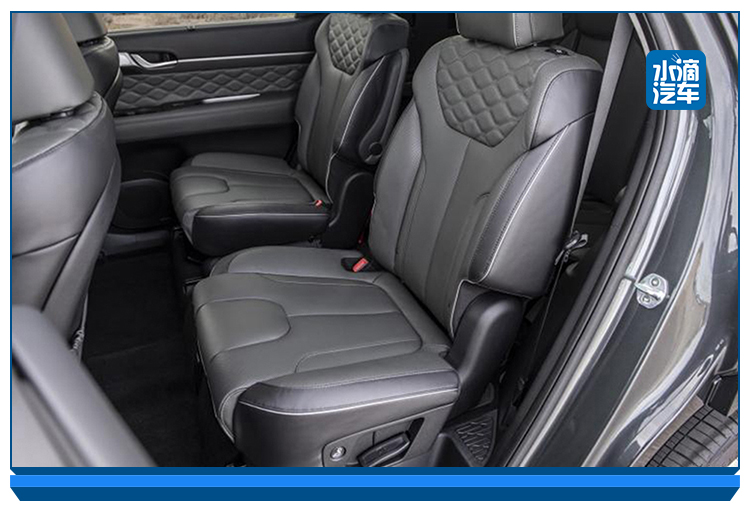 门板和座椅采用了很多菱格状缝线的真皮包裹,体现现代旗舰车型的档次感,官图为一个7座车型,采用2+2+3布局,第二排座椅可以进行前后和靠背角度调节,保证舒适度,不过第三排的中间座椅显得有些牵强。另外美国市场,现代PALISADE也提供8座的2+3+3版本。
