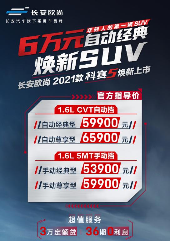7月31日,长安欧尚2021款科赛5正式上市,共推出四款车型,其中两款手动挡车型,两款自动挡车型。新车官方指导价5.39-6.59万元,同时还推出低首付,低月供的优惠政策。