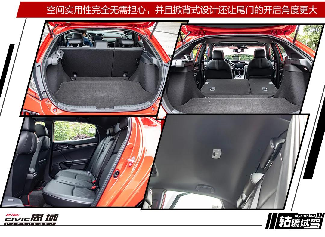 作为Hatchback车型,相信大家还有一点比较关心的是空间实用性。对此,有空间魔术师之称的本田是不会让大家失望的。思域Hatchback的后备箱空间和第二排座椅乘坐都能轻松满足日常家用需求。其中,第二排座椅的腿部空间与三厢版几乎一样,并且椅背还可以放倒,从而得到更宽敞的载物空间。另外,第二排座椅上方车顶处还进行了掏空处理,这有效保证后排乘客头部空间的设计,身高180cm的男子坐在后排也能有够用的乘坐空间。