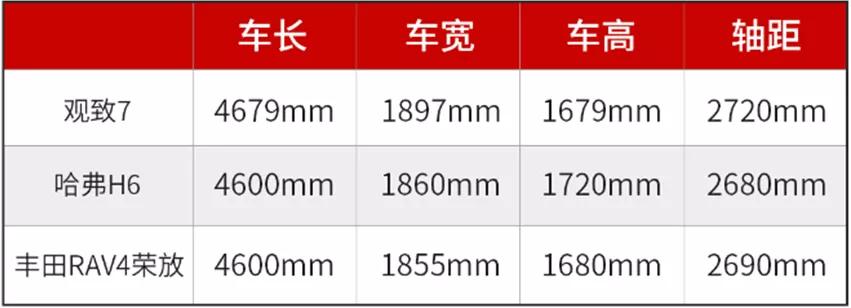 其一,从公布的观致7的车身尺寸来看,该车长/宽/高为4679/1897/1679mm,轴距为2720mm。通过上面表格可以看出,即便面对合资和自主品牌代表车型丰田荣放 (配置|询价)和哈弗H6,观致7在空间表现上也丝毫不落下风。