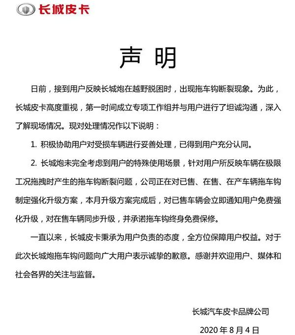 长城对此倒是直言不讳,第一时间承认长城炮拖车钩事件属长城汽车对极限工况的判断不足,以至于采用了较为不合理的焊接式拖车钩结构。未来,长城汽车将协助受损车辆进行妥善处理,这种处理方式现已获得受损车主的认可。并且,长城已对已售、在售、在产的拖车钩进行强化,避免类似情况再次发生。