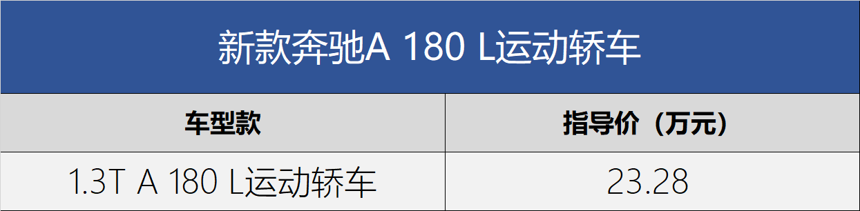 日前,我们从奔驰官网获悉,新款北京奔驰A 180 L运动轿车正式上市,售价23.28万元。相较于现款车型,新车价格上调3000元,同时部分配置也进行了调整。
