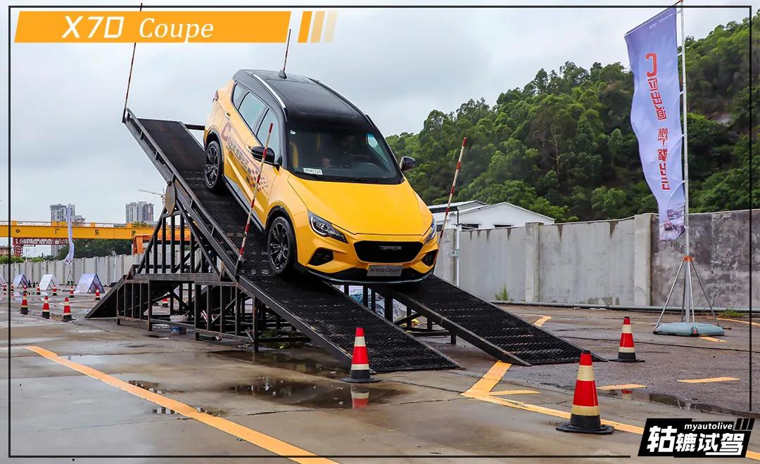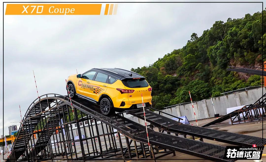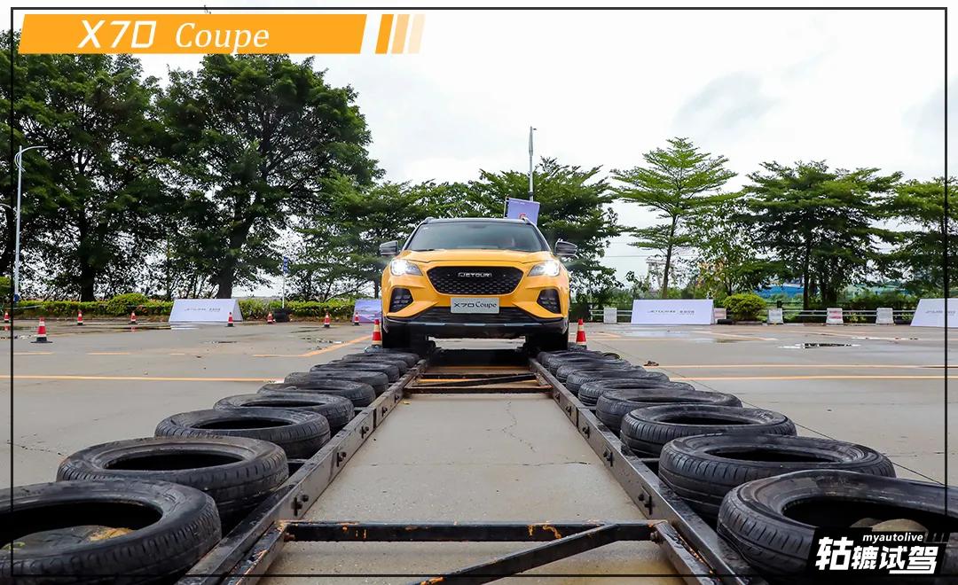 接下来捷途X70 Coupe要面对的是轮胎路挑战,其配备了前麦弗逊式独立悬架+后多连杆独立悬架,整体调教兼备运动与舒适。不过在通过轮胎路时,车内的颠簸感还是比较强烈的,整个底盘还是能给到非常扎实的感觉。