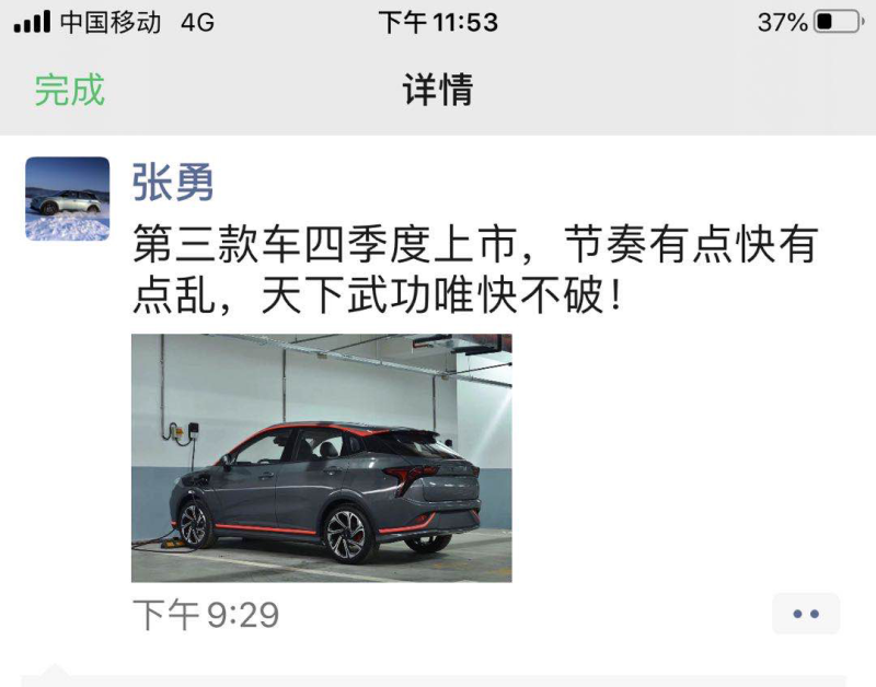 近日,合众公司联合创始人兼首席执行官张勇曝光了哪吒汽车第三款车型的实车图,并表示新车将在今年四季度上市。