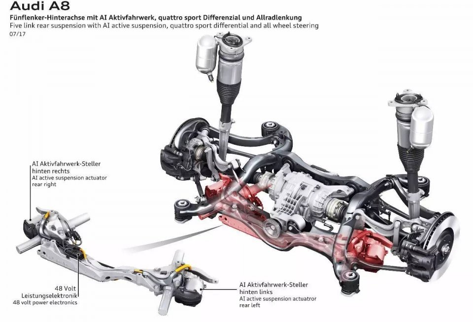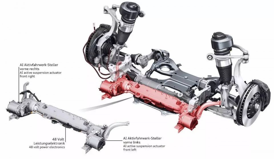 另一个显著提升舒适性的底盘技术亮点已运用于奥迪A8,主动悬架技术。这是一个完全主动的机电式操控悬架系统。每个车轮都带有一个电机,并由48V主电气系统供能。主动悬架的控制信号由电控底盘系统每五毫秒发送一次。皮带驱动和紧凑型应变波齿轮将电机的扭矩转换为1100 牛米,并将其传递到钢制扭矩管。扭矩从扭杆末端通过杠杆和连接杆到达底盘。在前轴上,扭矩作用在自适应空气悬架的空气弹簧支柱上,在后轴上则作用于横向控制臂上。