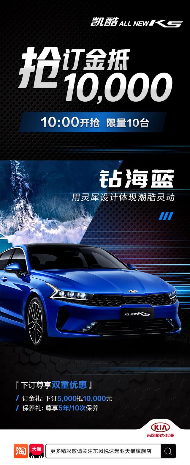 “5000元抵10000元!每日10点秒拼手速,限量十台!“凯酷 (配置|询价)(ALL NEW K5)自4月开启预售,近日于东风悦达起亚天猫官方旗舰店推出“下定凯酷,尊享潮新礼包”活动,除抢订金抵10000元超值福利外,还提供100元订金抵500元车款,1,000元订金抵3,000元车款等“豪“礼。此外,潮新礼包还有一重“潮级保养礼”,抢订成功的客户均可享5年10次免费基础保养。