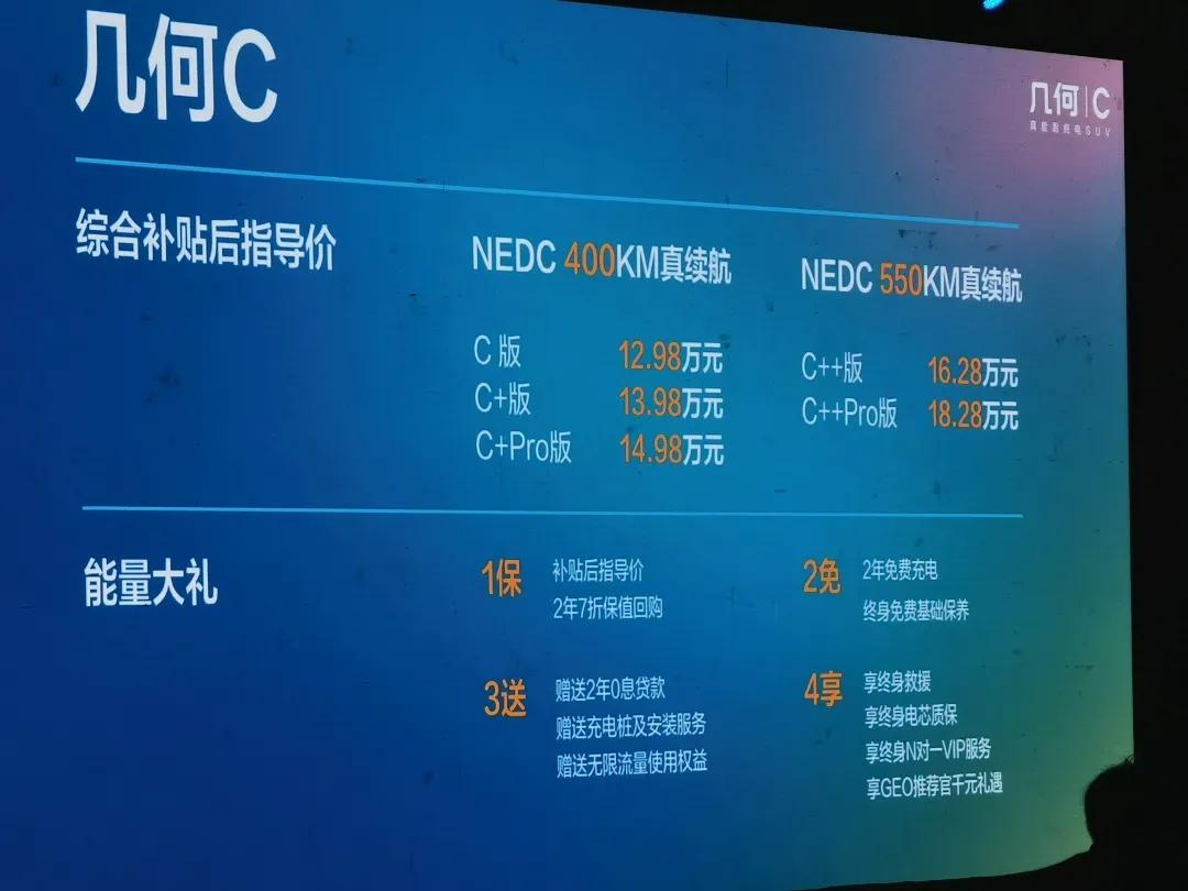 8月7日,几何汽车旗下首款纯电SUV几何C正式上市,共计推出400km及550km两种续航版本,补贴后售价为12.98-18.28万元。