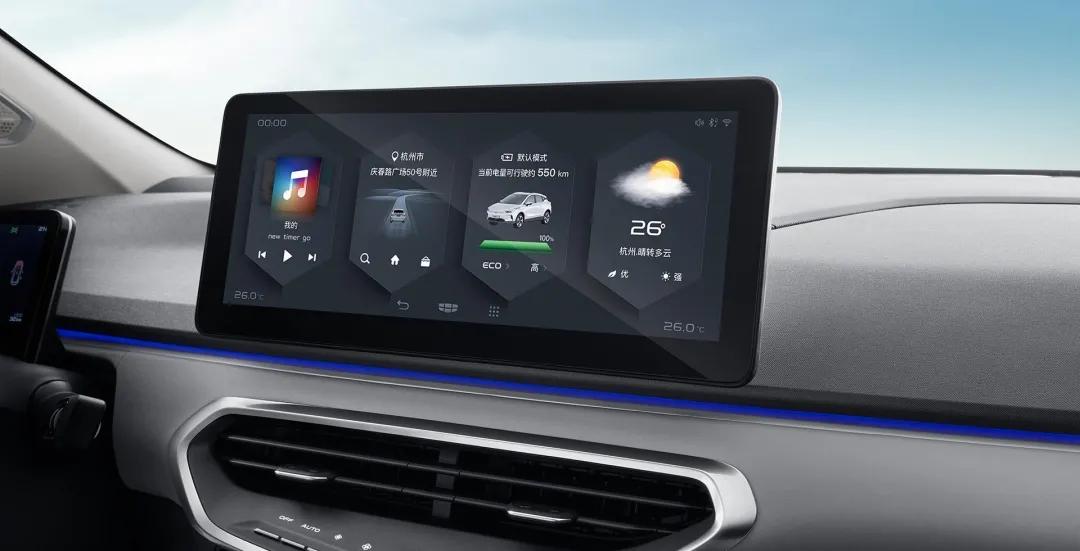中控屏采用12.3英寸的大屏显示,搭载GKUI 19吉客智能交互系统。可以实现在线高德3D导航、在线音乐、360°全景影像、智能家居双向控制,AI智能语音系统等等流行的车联网功能。
