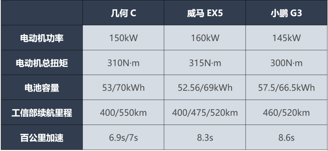 从几何C的定位和定价来看,首当其冲便要面对两款来自造车新势力的产品——威马EX5和小鹏G3。