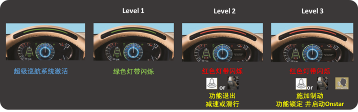 如果注意力系统判断驾驶员视线没集中在前方道路,那Super Cruise将会以绿色灯带闪烁方式进行提示,继而以红色灯带闪烁、座椅振动和声音警示进行提醒。如果驾驶员还没接管车辆,那Super Cruise则退出驾驶辅助,并对车辆缓慢施加制动直至车辆停下,同时安吉星OnStar人工坐席也会主动联系驾驶员,以防意外发生。