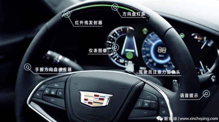 其中驾驶员注意力系统由方向盘上的摄像头、红外线传感器、方向盘握持传感器、方向盘灯带、座椅震动和声音警示等部件所组成。当Super Cruise启用后,方向盘的灯带变为绿色,此时摄像头以及红外线发射器会追踪驾驶员的头部位置和脸部特征以判断其视线方向。