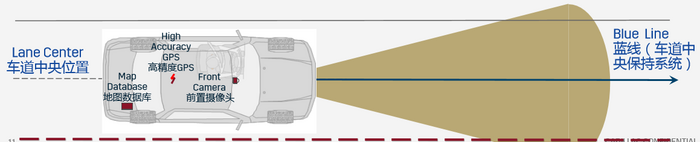蓝线车道中央保持系统则结合高精度地图、高精度GPS定位和前视摄像头的数据,让车辆能够最大程度上免受隧道、夜间、大雾、暴雨等复杂环境的干扰,保证了车道居中保持的稳定性。