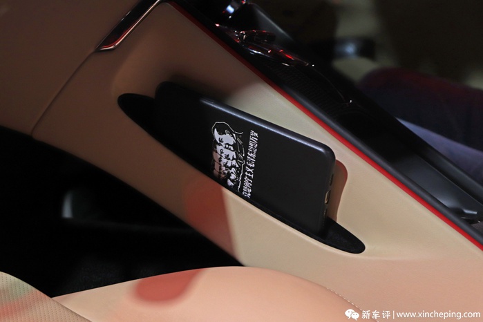 更难得的是,在中央屏幕区域两侧,法拉利还各挖了一个专门放手机的槽,在这个区域底下竟然还被镂空了,掏出很大一个空间来放杂物,法拉利为了提升Roma实用性真的花了不少心思。