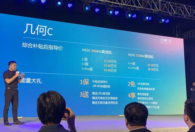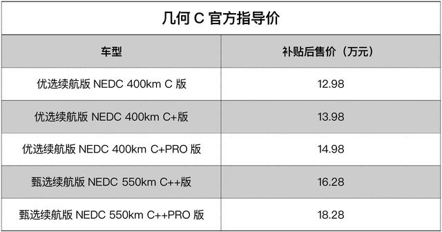 8月8日,几何汽车首款纯电SUV几何C于北京地区正式上市,新车共推出5款车型,提供NEDC 400km、NEDC 550km两个续航版本,综合补贴后售价为12.98-18.28万元。