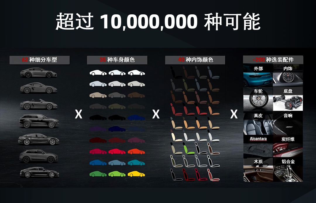 在打造限量版车型,推出限量版车型服务后,部门再次更名为“Porsche Exclusive Manufaktur”,以彰显其在大量的定制项目上所展现个性化程度,以及品质和工艺水平。62种细分车型,35种车身颜色,40种内饰颜色,近200种选装配件,能为客户车辆提供超过1000万种个性化选装配置组合,定义每一辆保时捷。