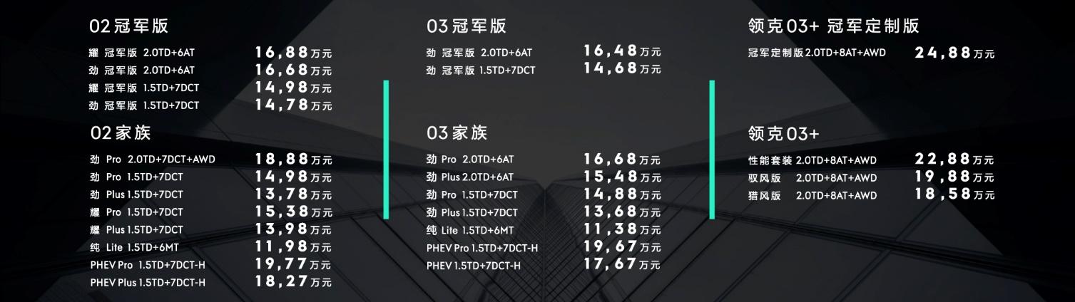 这不,就在8月10日晚间,新款领克02、03及03+以及冠军版多款新车正式上市,其中一款领克03 (配置|询价)+冠军定制版售价为24.88万元,堪称史上最贵领克车型,此前领克旗下最贵车型为指导售价23.58万元的领克05 (配置|询价)时间限量版。那么这款目前最贵的领克03+冠军定制版车型有什么亮点?又值不值得大家购买呢?接下来咖哥就和大家好好分析一波。