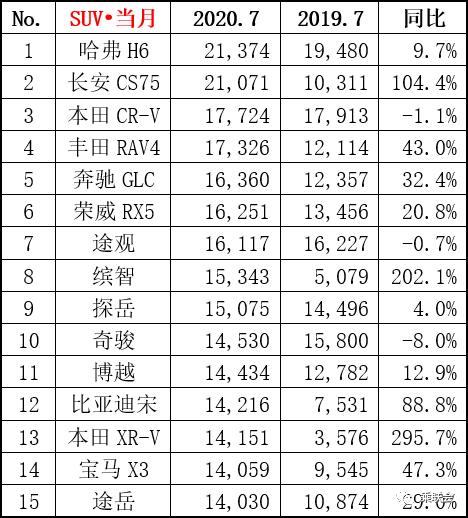 奔驰GLC在7月销量再创新高,跻身榜单前五,拿下高端SUV的冠军宝座;合资SUV车型中,本田缤智增幅高达202.1%,销量为15342辆;