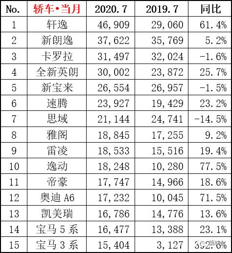 7月,日产轩逸除了再次稳住了冠军位置,同比超过60%的增幅也显得非常亮眼。另外,在入榜的前15名中,仅有卡罗拉、新宝来、思域有些小幅的同比下降,其余几乎均实现了大幅增长。
