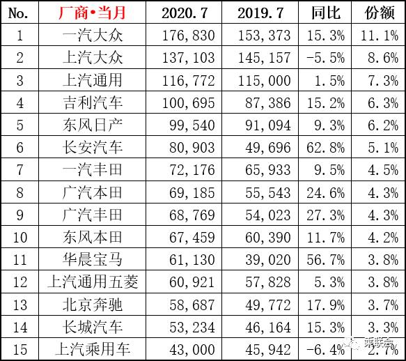 首先来看车企销量排行,7月,一汽大众、上汽大众和上汽通用依旧引领市场,位列前三;吉利汽车、东风日产紧随其后,月销达到高水平的10万辆上下;长安汽车和华晨宝马超常发挥,月度增长率超过50%;