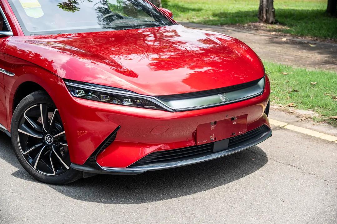 而实际上,汉吸引人的地方也不止车身尺寸,它的外观、它的内饰设计也足以让它在这个级别占有一席之地。从2年前比亚迪推出第二代唐开始,设计就正式成为了比亚迪车系的卖点之一。以面前的这台汉为例,只利用少量但连续且蜿蜒的线条就能营造出富有动感的前脸,恰到好处的高光镀铬饰条应用也颇具高级感,引擎盖两侧高耸的隆起则是让车头更具攻击性。而这些,在以前的比亚迪车型上是很难想象的。