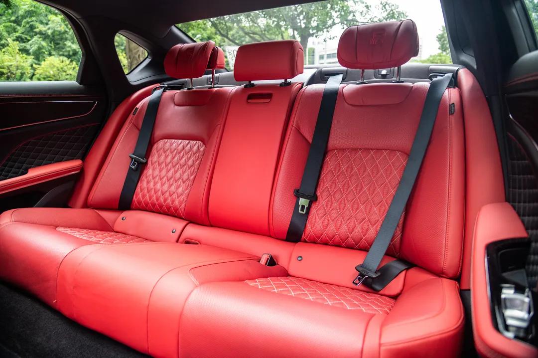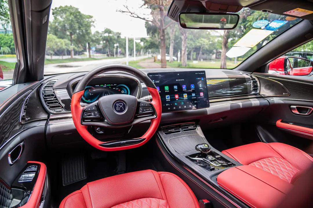 来到车内,汉的内饰也是我们熟悉的风格,15.6英寸窄边框中控屏幕充当中控台的视觉中心,大红色的座椅蒙皮以及方向盘、门版上的装饰让这套内饰的观感与相同风格的唐不一样,汉的内饰看起来更有活力一些。